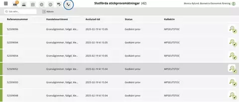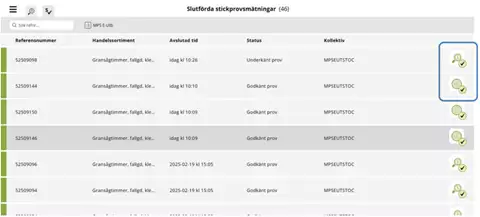 Som mätare kan du också se alla slutförda stickprovsmätningar för mätplatsen du är inloggad på. Listan visar alla sortiment och du kan söka på referensnummer om du vill se resultatet för ett specifikt stickprov.