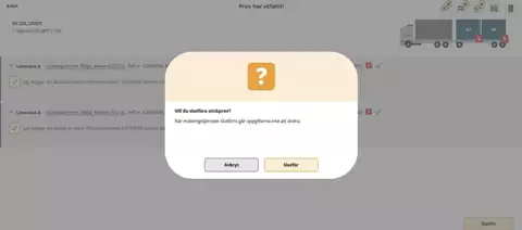 Efter att chauffören lagt av samtliga travar, vägt dem i tur och ordning samt taravägt ekipaget ska vägningsmomentet slutföras. Om något moment i vägningen gått fel, behöver chauffören kontakta mätare. I annat fall ska vägningen slutföras.