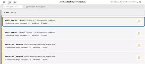 Avvikande stickprov visualiseras med en egen ikon som föreställer ett förstoringsglas. För att kontrollera resultaten och godkänna eller underkänna dem