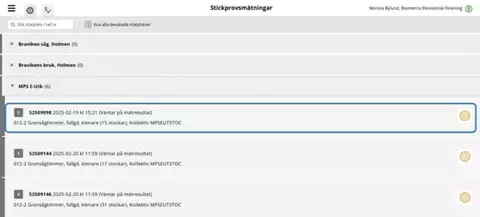 Som mätare kan du se alla väntande stickprov för rundvirkeskollektiv för den mätplats du är inloggad mot. Du ser stickproven under fliken Stockmätningar stickprov.