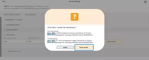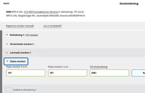Här finns möjlighet att avbryta för att gå tillbaka och justera innan flytt av stockar slutförs. Kontrollera att referensnumret stämmer.