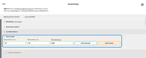 Ange vilka stockar du vill flytta genom att ange stocknummer fr.o.m. och t.o.m. Stocknummer hittar du i stocklistan.