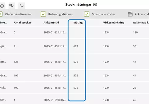 När stockmätningen är genomförd och klar i mätramssystemet skickas stockdatafilen automatiskt till Mätplatstödet (MPS). Detaljerna om aktuell stockmätningen syns i stocklistan.