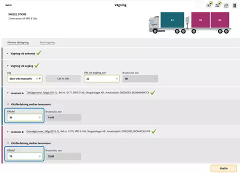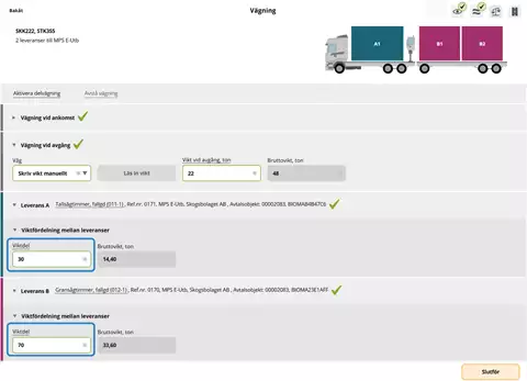 - Förslag till viktfördelning mellan leveranserna görs vid invägning.