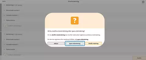Om du väljer att spara delmätning utan att slutföra är det möjligt att lägga till fler delmätningar i ett senare skede. Stockmätningen ligger då kvar i Mätplatsstödet (MPS) med godkänd delmätning.
