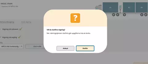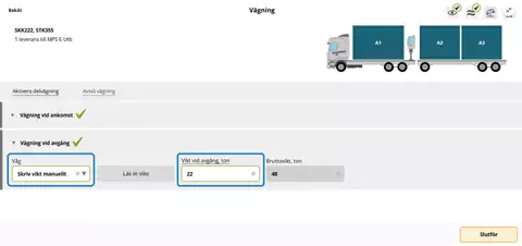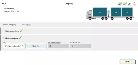 När angiven bruttokvantitet är godkänd och slutförd är nästa steg att godkänna vägning vid avgång. I många fall har vikten redan registrerats från vågen av chauffören och ska nu godkännas och slutföras i Mätplatsstödet (MPS).