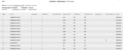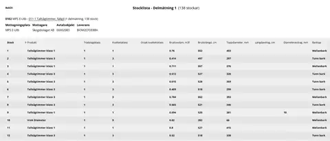 Stocklistan innehåller information om barktyp, produkt, trädslag, kvalitet, längd, diameter och avdrag.