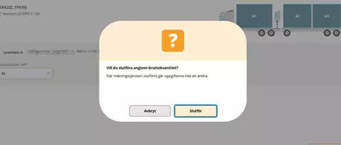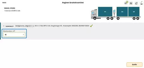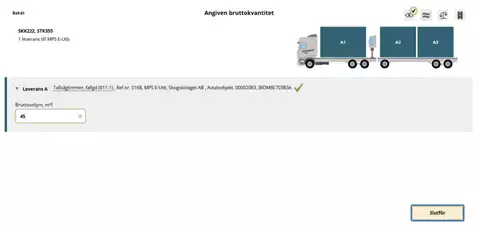 Nästa steg är att godkänna angiven bruttokvantitet. Angiven bruttokvantitet är den uppskattning av lastad volym som chauffören anger i leveransaviseringen. Den bruttokvantitet som redovisas bör motsvara den avlämnade volymen. Den är inte ersättningsgrundande utan används för lagerhantering och statistik.