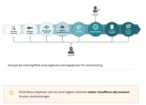 Nedan illustreras ett exempel på ett mätningsflöde för stockmätning med ingående mätningstjänster. I bilden länkas mätare och chaufför till de mätningstjänster som mätaren eller chauffören utför. Beroende på mätplats, hur flödet är uppsatt, kan detta se olika ut.