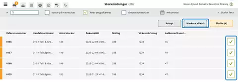 Slutför flera stockmätningar genom att antingen klicka i rutan för varje stockmätning eller välj knappen Markera alla.