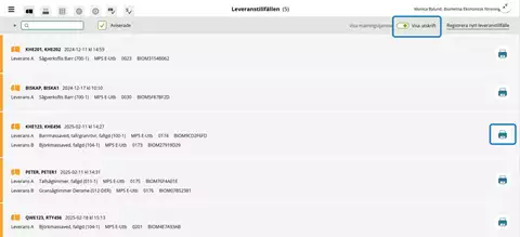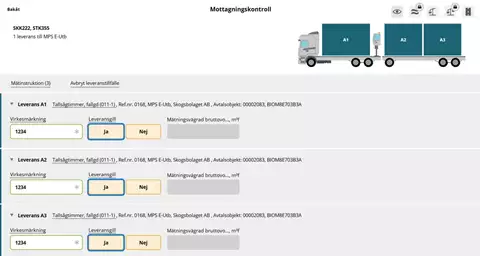 Ett leveranstillfälle kan ha flera ingående leveranser. Kontrollera att informationen från leveransaviseringen är korrekt och att leveranserna är leveransgilla. I exemplet är alla leveranser leveransgilla.