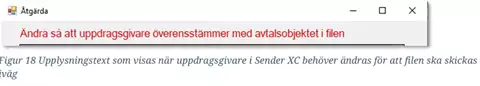 I fliken Åtgärda filer visas vilka filer som inte uppfyller de kontroller som finns i Sender XC och därför inte kunnat skickas men som är möjliga att justera så att de klarar kontrollen. Det kan till exempel saknas avtalsobjekt eller att uppdragsgivaren på det avtalsobjekt som finns i filen inte överensstämmer med den uppdragsgivare som valts i Sender XC.