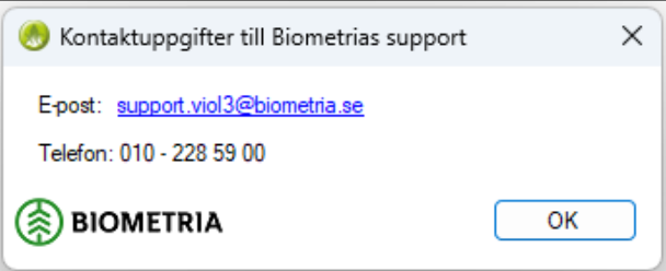 Om du har frågor och inte hittar det du söker i handböckerna kan du skicka e-post eller ringa till Biometrias -Support. Mer information om vår Support hittar du på Violweb eller www.biometria.se.