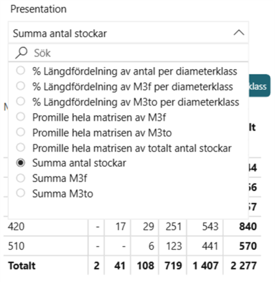 - Analysera diameterfördelning med antal stammar och volym per diameterklass.
