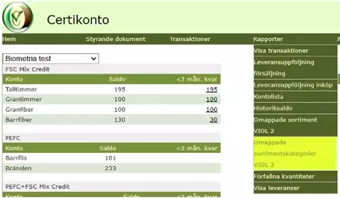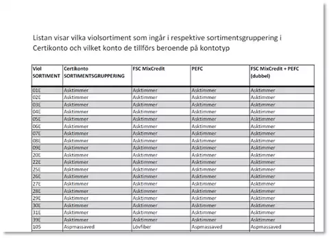 Endast skogliga sortimentskategorier hanteras av Certikonto. I Sortimentskategori till handelssortiment VIOL 3 framgår vilka sortiment som exkluderas genom ett ”J” i kolumn Exkluderat: