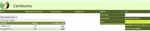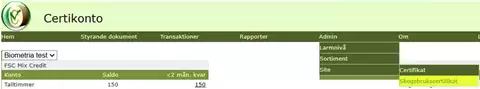 Förutom Site behövs även behörighet till Certikonto. Behörigheten läggs upp av Biometria och beställs via ett formulär på hemsidan som finns under meny Tjänster – Certifierade volymer.