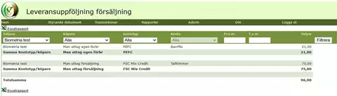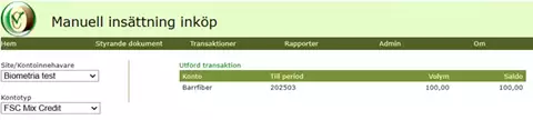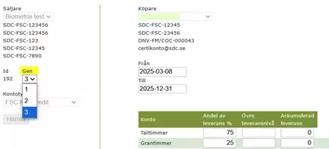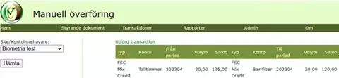 - Om säljaren är organisation utan Site i Certikonto kan volymen via funktionen Skogsbrukscertifikat fylla köparens konto med 100%.