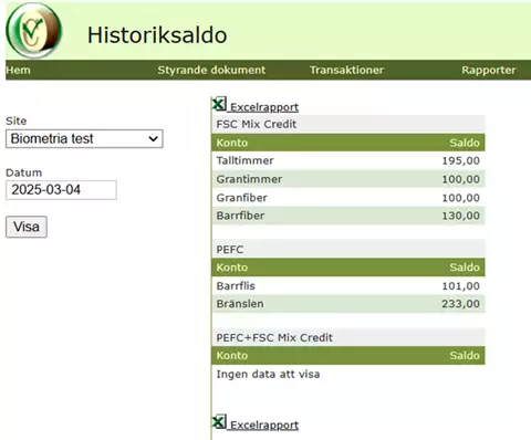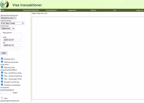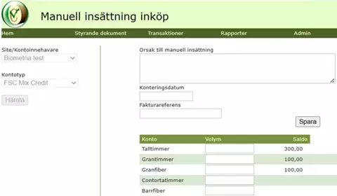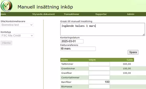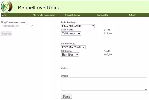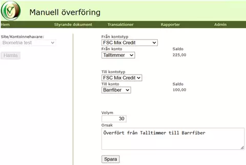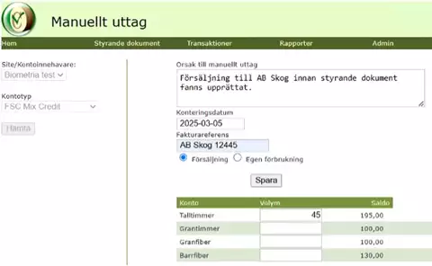 Transaktioner via styrande dokument görs endast vid fysisk leverans av råvara men råvaran i leveransen behöver inte vara certifierad. Negativa saldon på konto tillåts inte, varken för maskinella eller manuella transaktioner och det får heller inte finnas äldre kvantiteter 24 månader.