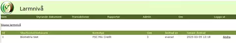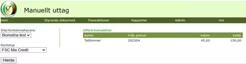 | Förtydligande av manuellt uttag Nya regler för FSC. Kvantiteter för FSC lagras 24 mån. Komplettering av regelverk för samtliga Mätande företag, förhindra negativa saldon och lagring av kvantiteter i 24 månader för samtliga konton. Kompletteringar för VIOL 3 Ändring av åtkomst Certikonto via biometria.se Justering av text i avsnitt 11.2 Justering av regler för VIOL 3 | 2024-07-02 |
