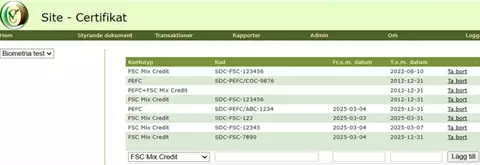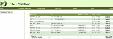 Innan du kan börja använda Certikonto ska du beskriva de certifikat som du fått från FSC respektive PEFC genom att lägga till dessa som Certifikat i Certikonto. För att kunna göra detta måste du ha behörighetsnivå Administrera allt.