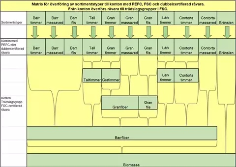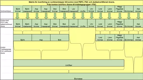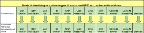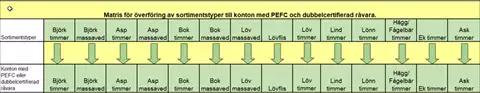Bilden ovan visar överföringsreglerna för barrsortiment, bilden nedan gäller lövsortiment från dubbelcertifierat till PEFC.