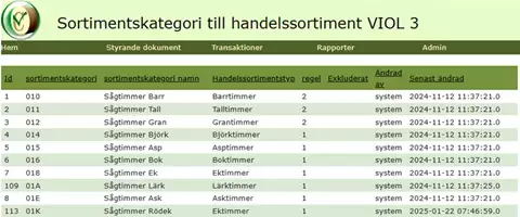 I Sortimentskategori till handelssortiment VIOL 3 visas samtliga sortimentskategorier som finns i VIOL 3. Bilden nedan visar exempelvis att om det kommer en leverans som tillhör sortimentskategori 010 så landar den på Handelssortimentstyp Barrtimmer och mappas därefter enligt den 2:a som står i kolumn regel enligt regelverk 2 (ovan).