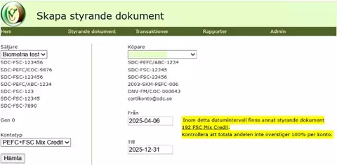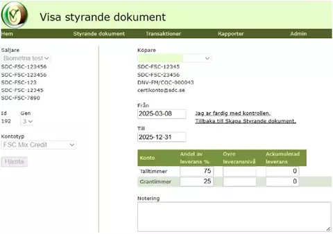 Styrande dokument beskriver den andel certifierad råvara som säljare och köpare kommit överens om för aktuell tidsperiod. Kvantiteter överförs från/till respektive parts konto automatiskt när mätningstransaktion skapas i VIOL. Båda parter måste ha en Site i Certikonto.