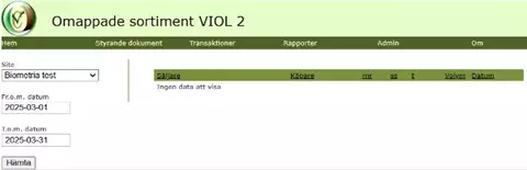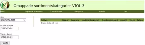 Sortiment som inte återfinns enligt ovan (VIOL-kodade och exkluderade) mappas inte till något konto men loggas i systemet. I rapporten Omappade sortiment hittar du transaktioner med sortimentskod som inte fyller något konto.