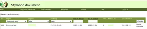 För att makulera ett styrande dokument klickar du på Makulera i kolumnen längst ut till höger. Ett styrande dokument kan endast makuleras innan någon mätning har fått träff mot det.