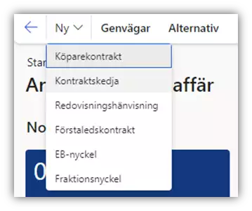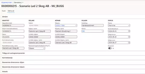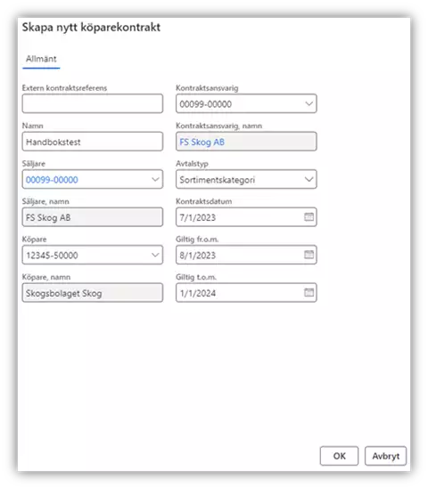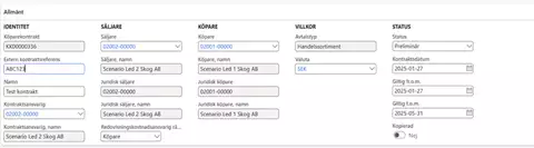 3. Extern Kontraktsreferens motsvarar kundens egen identitet på köparekontraktet om det skapas via integration. Om köparekontraktet skapas direkt via klient är det möjligt att ange en valfri referens. Lämnas fältet tomt, kommer det unika kontraktsnumret som tilldelas vid skapande av kontraktet att sättas som värde.