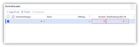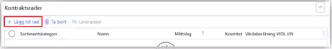 1. Under flik Kontraktsrader definieras vilket sortiment köparekontraktet omfattar. Tryck på Lägg till rad för respektive sortiment som ska läggas upp som en rad i kontraktet. Nya rader i kontraktet kan läggas till även när köparekontraktet har status Aktiv.