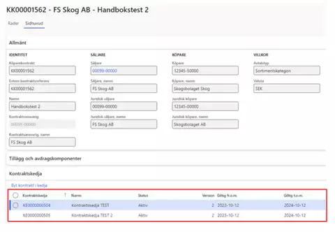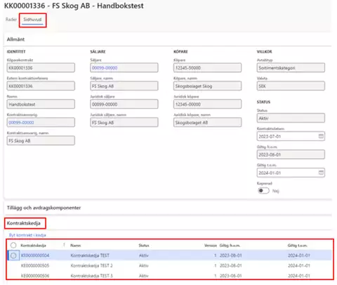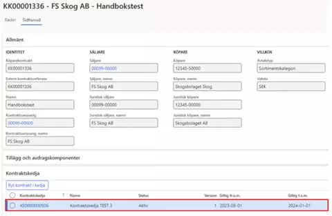 2. På flik Sidhuvud, under rubrik Kontraktskedja syns den eller de kontraktskedjor som köparekontraktet (i detta exempel KK00001336) ingår i; KE00000504,KE00000505 och KE00000506.