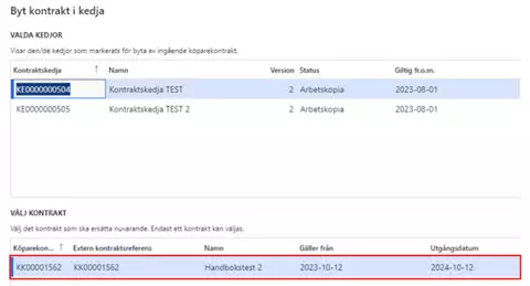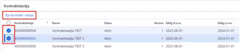 3. Markera den eller de kontraktskedjor som ska bytas ut. I detta exempel vill vi byta ut kontrakt KK00001336 i två kontraktskedjor; KE00000505 och KE00000506. Tryck Byt kontrakt i kedja.