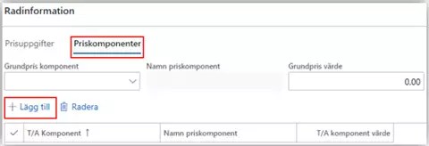 3.2. Under Priskomponenter kan en grundpriskomponent som får användas på köparekontraktsrader läggas till. Det kan maximalt finnas en grundpriskomponent på en kontraktsrad och det kan endast läggas till om det inte finns någon prislista inlagd under Prisuppgifter. Ett grundprisvärde kan också anges där värdet anges i heltal med två decimaler. En kontraktsrad kan innehålla noll till flera tillägg- och avdragskomponenter (T/A-komponenter), samt ett eventuellt värde per T/A-komponent. Samtliga T/A-komponenter kommer att användas i värdeberäkningen om komponentens villkor stämmer. Detta läggs till genom att klicka på Lägg till. För att rader en T/A-komponent, klicka på Radera.