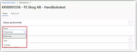 4. För att ändra status på köparekontraktet, gå till flik Status på kontrakt. Välj sedan status från listan. Preliminär är den status som köparekontraktet får när det skapas. För att köparekontraktet ska kunna hittas i andra delar av affärssystemet och användas i råvaruaffären måste köparekontraktet få status Aktiv. För att ändra status till aktiv måste alla obligatoriska uppgifter ha fyllts i.