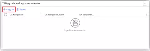2. Under flik Tillägg och avdragskomponenter går det att välja in en eller flera T/Akomponenter. Ett värde kan också läggas till på T/A-komponenten. Om en T/Akomponent ligger på sidhuvudet gäller den för samtliga sortiment i kontraktet. För att lägga till en T/A-komponent, klicka på Lägg till.