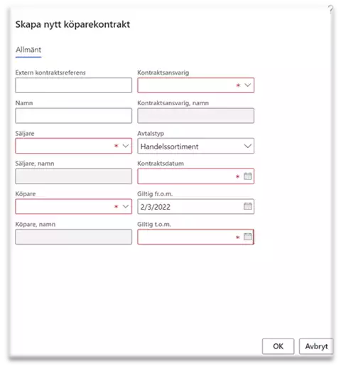 - Avtalstyp behövs för att kunna validera ingående sortiment och kan väljas till handelssortiment eller sortimentskategori från listan.