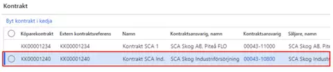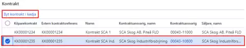 2. På flik Kontrakt: Markera det köparekontrakt som ska bytas ut och tryck Byt kontrakt i kedja.