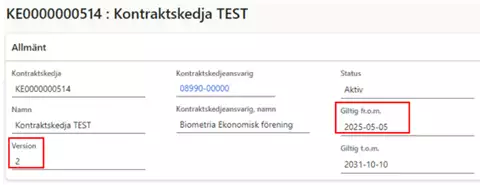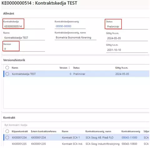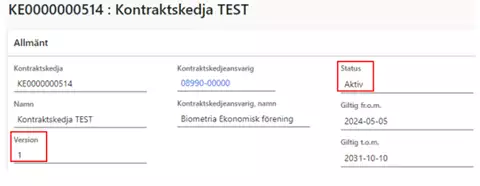 Kontraktskedjan visas nu med status Aktiv och version 1.