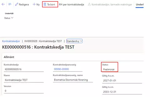 Så länge en kontraktskedja har status Preliminär är det möjligt att ta bort den. Öppna kontraktskedjan och tryck Ta bort i vyns övre del.