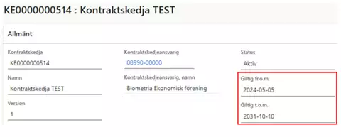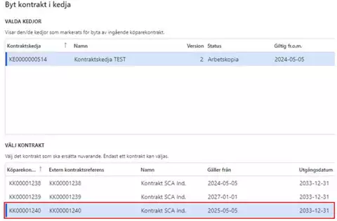 Kontraktskedjan har fått ett nytt versionsnummer (2) och eftersom det inbytta köparekontraktet har ett senare Giltigt fr.o.m. datum än Giltigt fr.o.m. på det kontrakt som byttes ut får kontraktskedjan ett nytt Giltigt fr.o.m. datum.