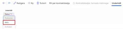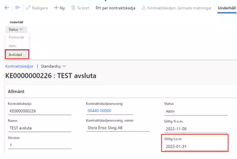 För att kunna använda kontraktskedjan behöver den aktiveras. Under rubrik Underhåll, välj Status och därefter Aktiv.