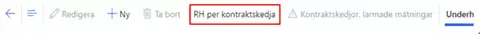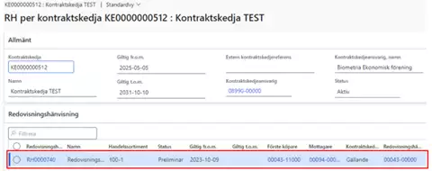 En kontraktskedja med status Aktiv, kan placeras i en redovisningshänvisning. Redovisningshänvisningen beskriver ett unikt affärsflöde och används vid destinering för att koppla samman förstaledskontrakt, kontraktskedjor och mottagningsplats. För att se i vilken redovisningshänvisning kontraktskedjan används, klicka på RH per kontraktskedja i vyns övre del.