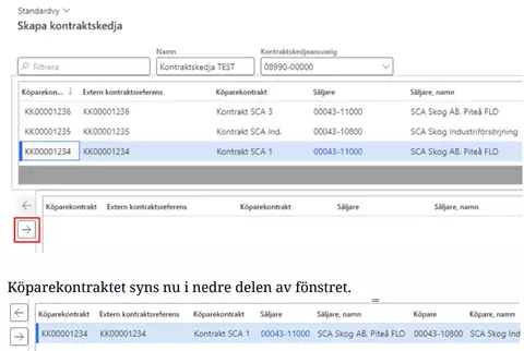 3. Markera det köparekontrakt som ska läggas till i kontraktskedjan och tryck på högerpil i den nedre delen av fönstret.