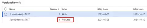 Under Versionshistorik kan man se att version 1 av kontraktskedjan har status Avslutad.