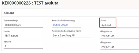 En kontraktskedja vars Giltigt t.o.m. datum har passerats och som inte finns i en aktiv redovisningshänvisning kan avslutas. Den som genomför avslutet måste ha roll Företagsadministratör och vara kopplad till den kontraktskedjeansvarige aktören.