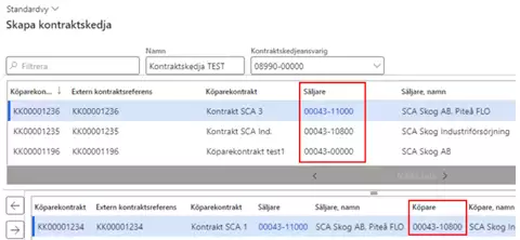 I övre delen av fönstret syns de köparekontrakt där säljaren har samma huvudkod, eller är densamme som köparen i kontraktet som nyss lades till.