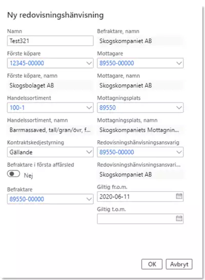 Du har nu skapat en redovisningshänvisning och kan därmed destinera det aktuella handelssortimentet i ditt avtalsobjekt. Observera däremot att verifieringen av huruvida redovisningshänvisningen kan användas för mätbeodring (att det exempelvis finns mätningstjänster) sker inte när redovisningshänvisningen sparas, utan sker först när du verifierar din destinering i ditt förstaledskontrakt.