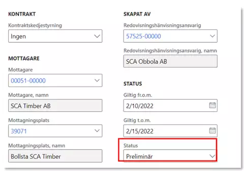 15. Under rubriken Detaljer så får du en överblick över din nya redovisningshänvisning. Vid status Preliminär så kan du fortfarande förändra samtliga fält.