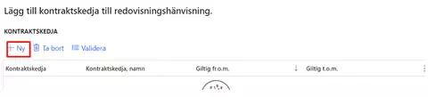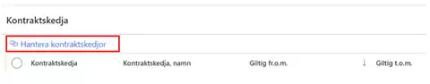 Lägg in din kontraktskedja genom att klicka på Hantera kontraktskedjor (Notera att denna rubrik inte finns om du har valt kontraktskedjestyrning = Ingen i punkt 9).